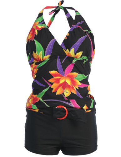 Beautiful pattern halter neck tankini swimwear set with contrasting boy leg shorts. Top features light removable padding and ties around the neck. Decorative belt completes the full coverage shorts. Both pieces come fully lined and ready for the beach or lounging around the pool. Don't miss out!!!