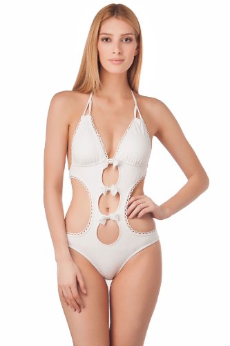 Monokini one piece features keyhole cutouts, bead and bow detail. Ties at neck and back.