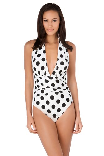 La Blanca French Dot One Piece Plunge Halter - White - 12