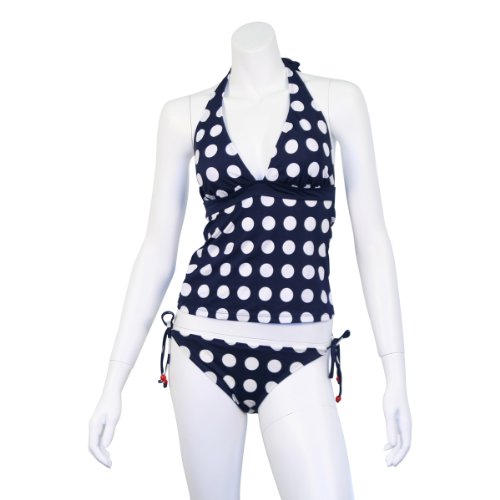 Ladies 2 Piece Tankini Swimsuit - Navy Polka Dots Large