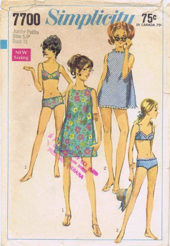 1960's Simplicity 7700 Vintage Sewing Pattern Junior Petites' Mini-Dress or Top and Two-Piece Bathing-Suit: The sleeveless and collarless mini-dress V. 1 and top V. 2 have slightly lowered round neckline and back zipper. V. 2 with embroidered eyelet edging trim is shorter than V. 1. The lined, two-piece bathing-suit V. 1 & 2 has bra with surplice front, self fabric shoulder straps and back button closing. The shorts have elastic casings in upper and leg edges. V. 2 bra and shorts have embroidered eyelet edging trim.