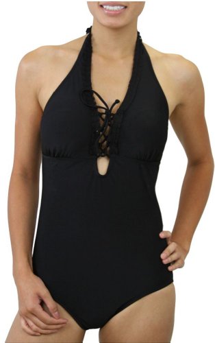 ToBeInStyle Women's One Piece Shaping Halter Tie-Up Front w/ Ruffle Trim Padded Fully Lined - Black - X-Large