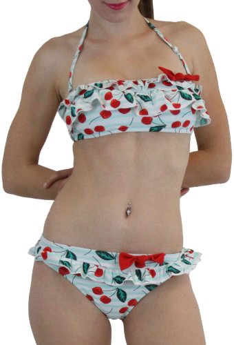 ToBeInStyle Women's Two Piece Ruffle Bandeau Bikini Swimsuit Padded Lined Convertable Neck Strap - Cherry - Large