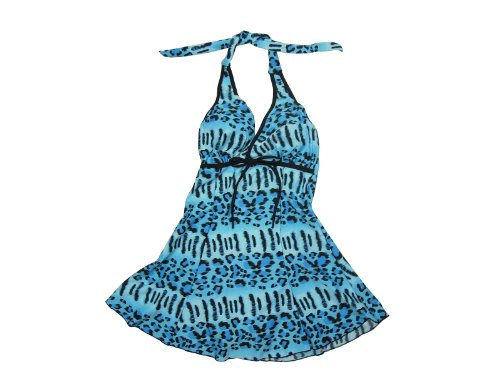 Women's One Piece Animal Print Swimwear w/ Skirt in Lake Blue / Leopard