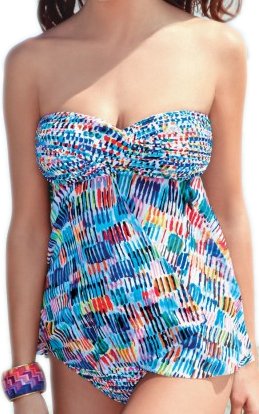This Profile by Gottex 2013 Spring Awakening Flyaway tankini is being featured in the In Style Magazine. The flyaway tankini top is a strapless tankini with a removable neck strap. It has soft cups and a bathing suit material bust with a mesh body that "flies open".